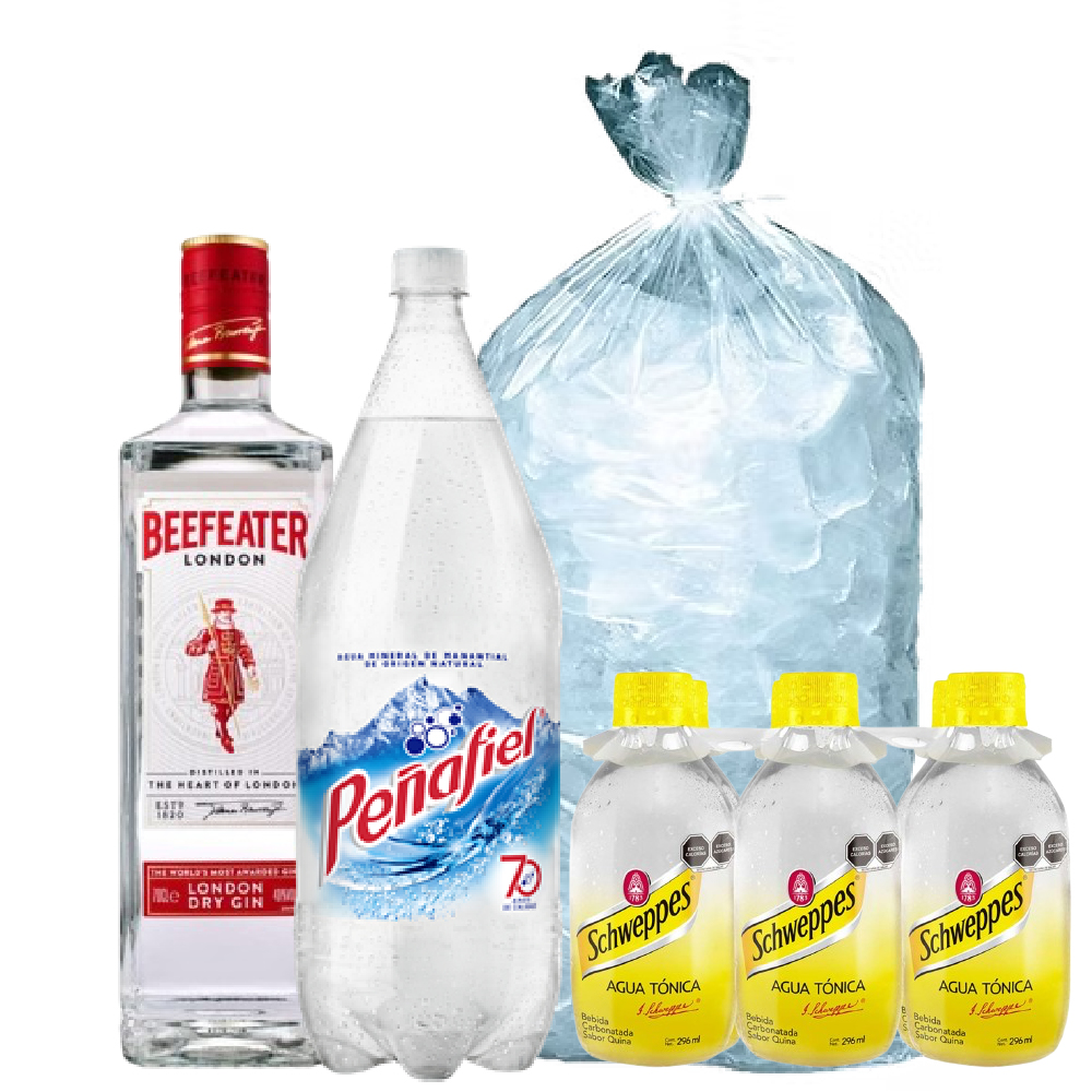 Disfruta un paquete con Beefeater, un six de agua tónica Schweppes, agua mineral de 2 litros y hielos. Ideal para una noche refrescante con un toque chilango.